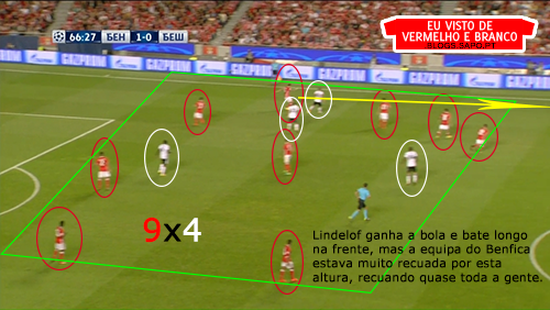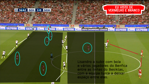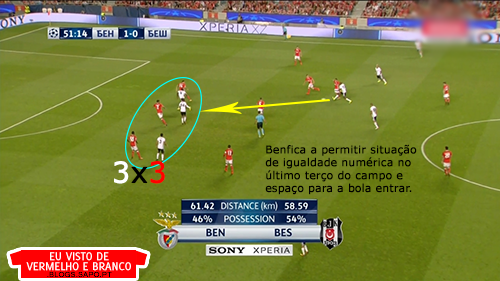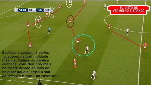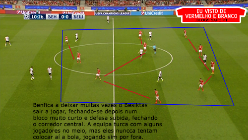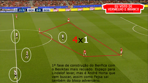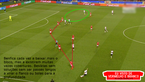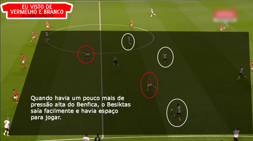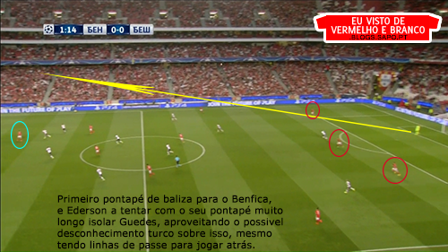 A 1ª fase de construção, deixou de ter soluções. Os centrais, quando eram pressionados, raramente tinham linhas de passe e a solução era sempre a mesma: colocar em Ederson para ele bater longo. Mesmo quando havia linhas de passe com a bola no guarda-redes ou poderiam ser criadas, Ederson batia longo. Os defesas do Besiktas ganhavam esses lances todos, até porque na frente de ataque do Benfica, não havia nenhuma referência e são todos jogadores muito baixos.