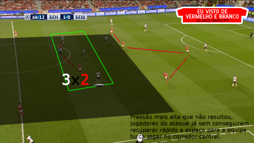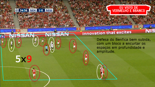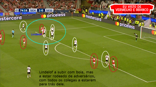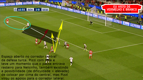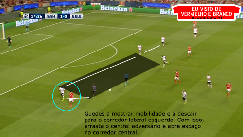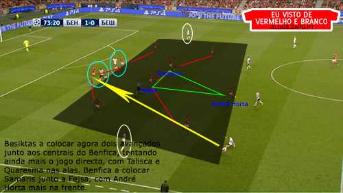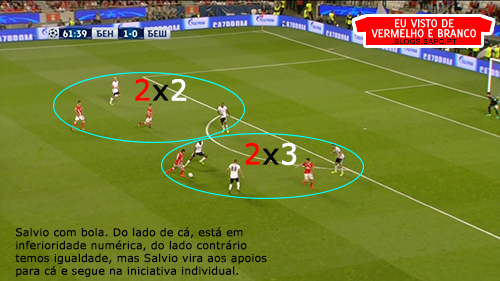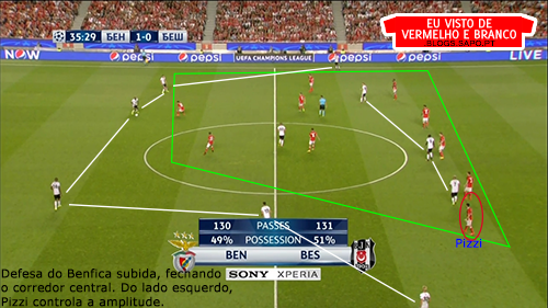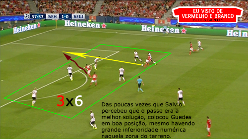 Pizzi partia da esquerda para o meio, o que deixava espaço para Grimaldo aproveitar, mas o lateral não tinha muitas ordens para atacar, já que tinha Quaresma no seu corredor o que o prendia bastante atrás. Salvio, no outro corredor, também vinha para dentro, criando alguns desequilíbrios, mas que depois eram inconsequentes.