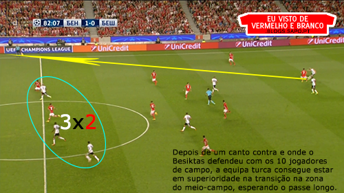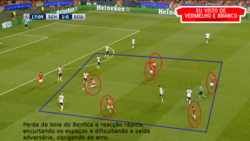 A equipa turca teve mais bola no início e pressionou mesmo algumas vezes a construção do Benfica, o que dificultava a saída a jogar desde trás. Algo em que o Benfica esteve bem desde início do jogo, e que se prolongou até ao final dos primeiros 45 minutos, foi a rápida reacção à perda, fechando logo os espaços e impedindo as tentativas de transição do Besiktas, onde eles são muito perigosos.
