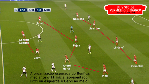 Terça-feira foi noite de estreia para o Benfica na Liga dos Campeões. O adversário era o Besiktas, campeão turco e já analisado por mim, aqui no blogue. Para este jogo, Rui Vitória voltou a estar privado de vários jogadores importantes devido a lesão. Quem também estava privado de aparecer no banco de suplentes, era o próprio treinador do Benfica, devido à expulsão no jogo contra o Bayern, na época passada. Para este jogo, o Benfica entrou com o seguinte 11: Ederson, Nelsinho, Lisandro, Lindelof, Grimaldo, Fejsa, André Horta, Salvio, Pizzi, Cervi e Gonçalo Guedes.