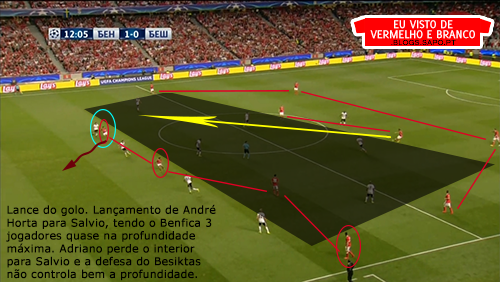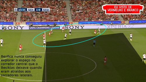 O Benfica, contudo, não conseguiu criar muitos lances de perigo e, em organização ofensiva, apenas um foi criado: o remate cruzado de Guedes para defesa de Tolga Zengin. Devido às características dos jogadores da frente, existia muita mobilidade no ataque, mas havia pouco espaço para ser explorado, já que a defesa do Besiktas esteve sempre num bloco médio e que tentava encurtar os espaços. Também nunca aproveitámos as saídas de posição dos elementos da defesa deles atrás das referências e que depois abriam espaços.