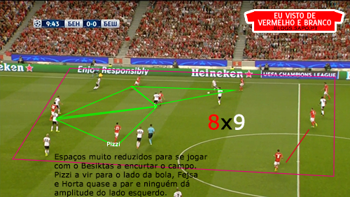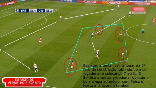 Como é habitual, o Benfica colocava muitos jogadores a construir, mesmo que o Besiktas muitas vezes não tivesse pressionado. Não havia grande risco, os médios baixavam e vinham buscar a bola no pé dos centrais.