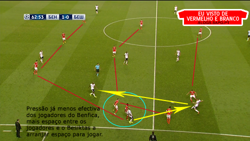 A 2ª parte trouxe um Besiktas ainda com mais bola e com o Benfica a recuar mais no terreno. A defesa tentava muitas vezes empurrar as linhas de médios e avançados mais para a frente, mas o que é certo é que isso não era conseguido. A equipa já não conseguia subir, os médios encostavam-se aos defesas e a linha defensiva recuava metros no relvado comparativamente ao que fizeram na primeira parte. Com a entrada de Talisca, os campeões turcos conseguiram ganhar alguém que estivesse mais próximo de Aboubakar e se colocasse junto à linha defensiva do Benfica.